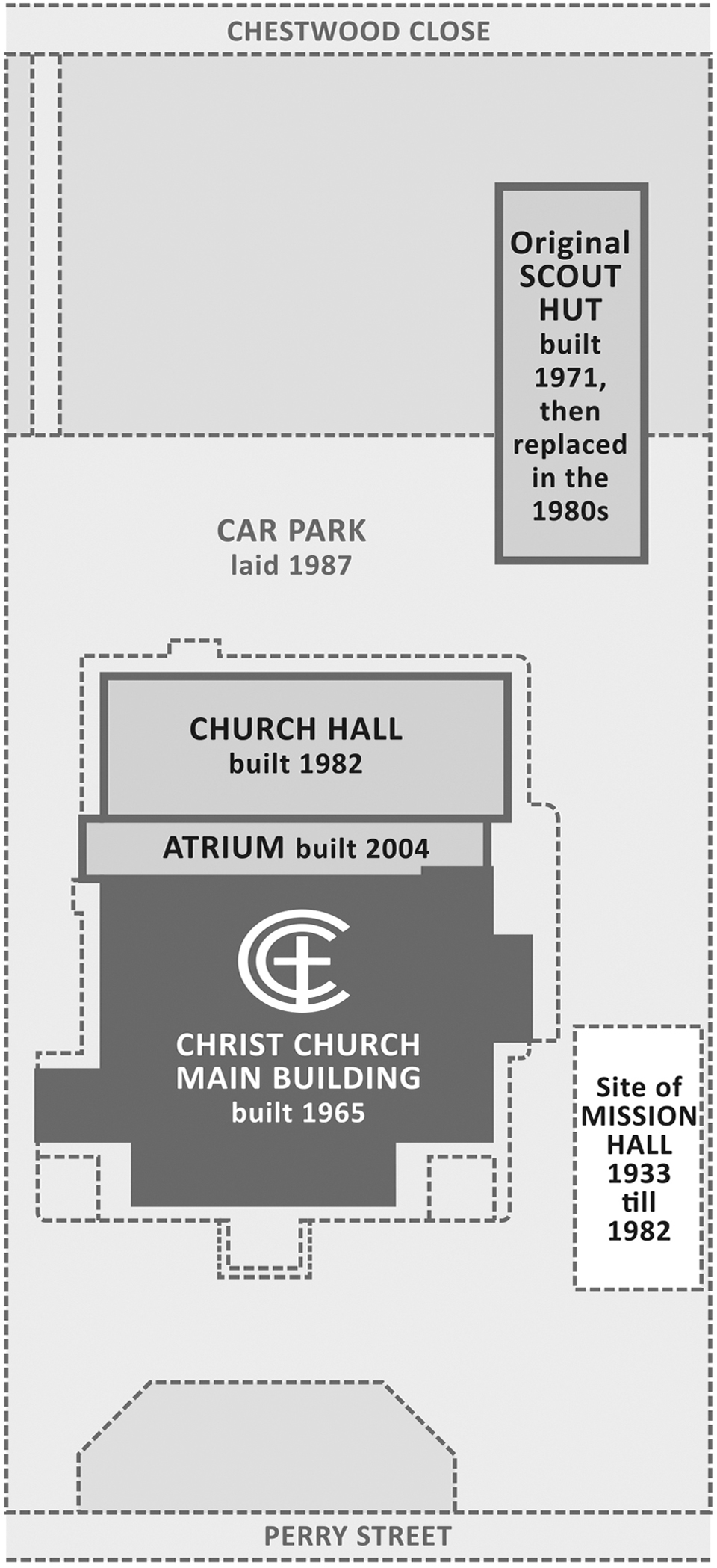 The original site was longer than it is now, extending about 420 feet from the road. In 1973, some of the land was sold, giving way to Chestwood Close, but also giving us a vicarage within a short walking distance from the church.